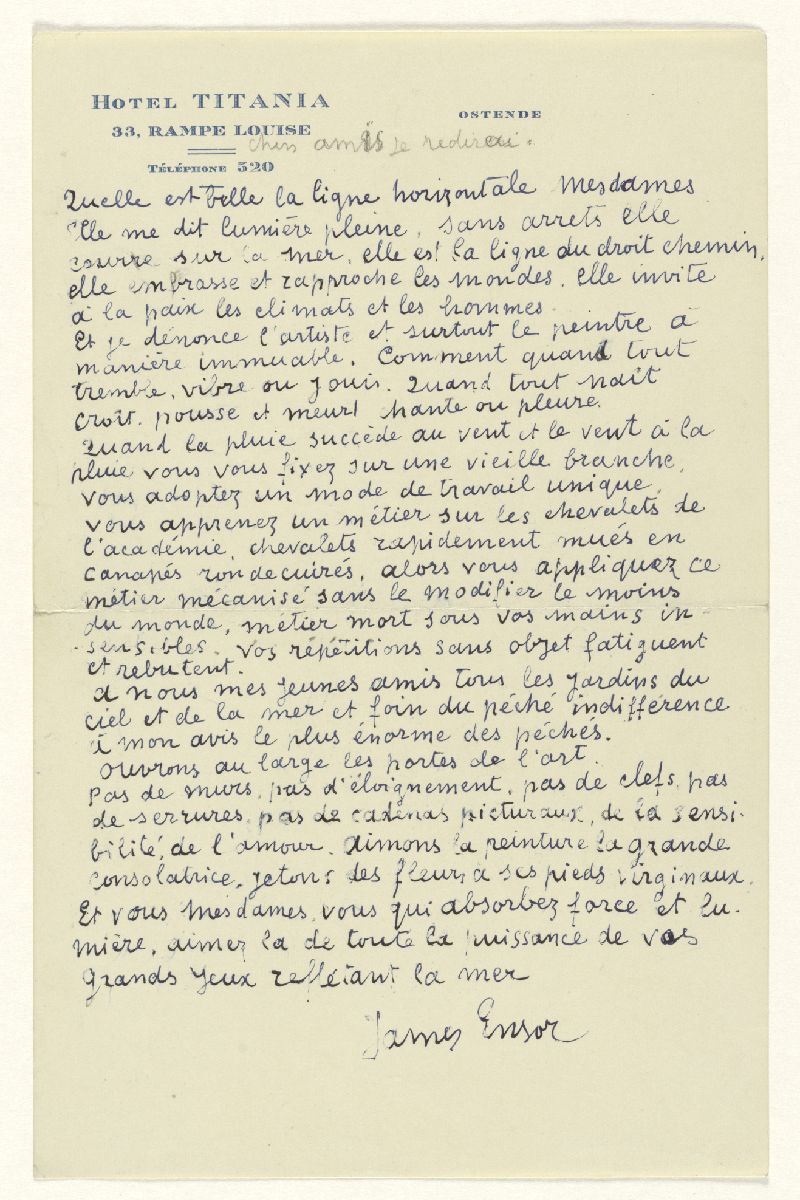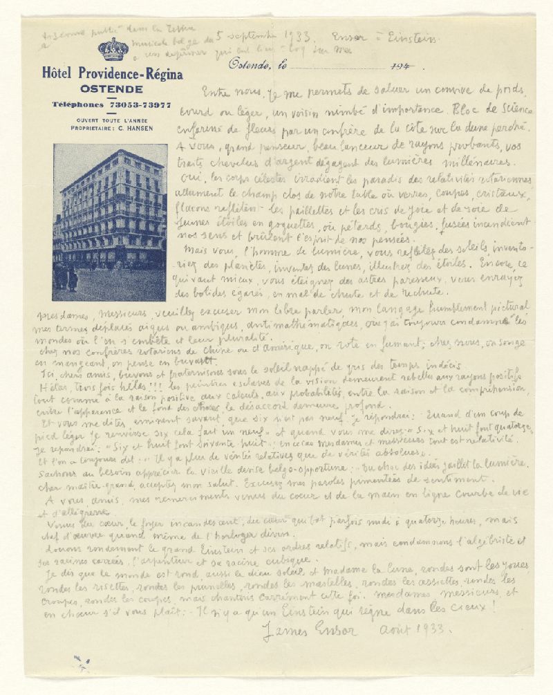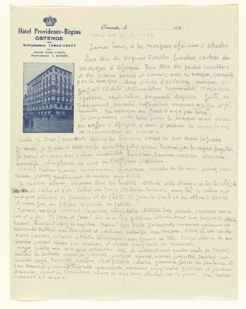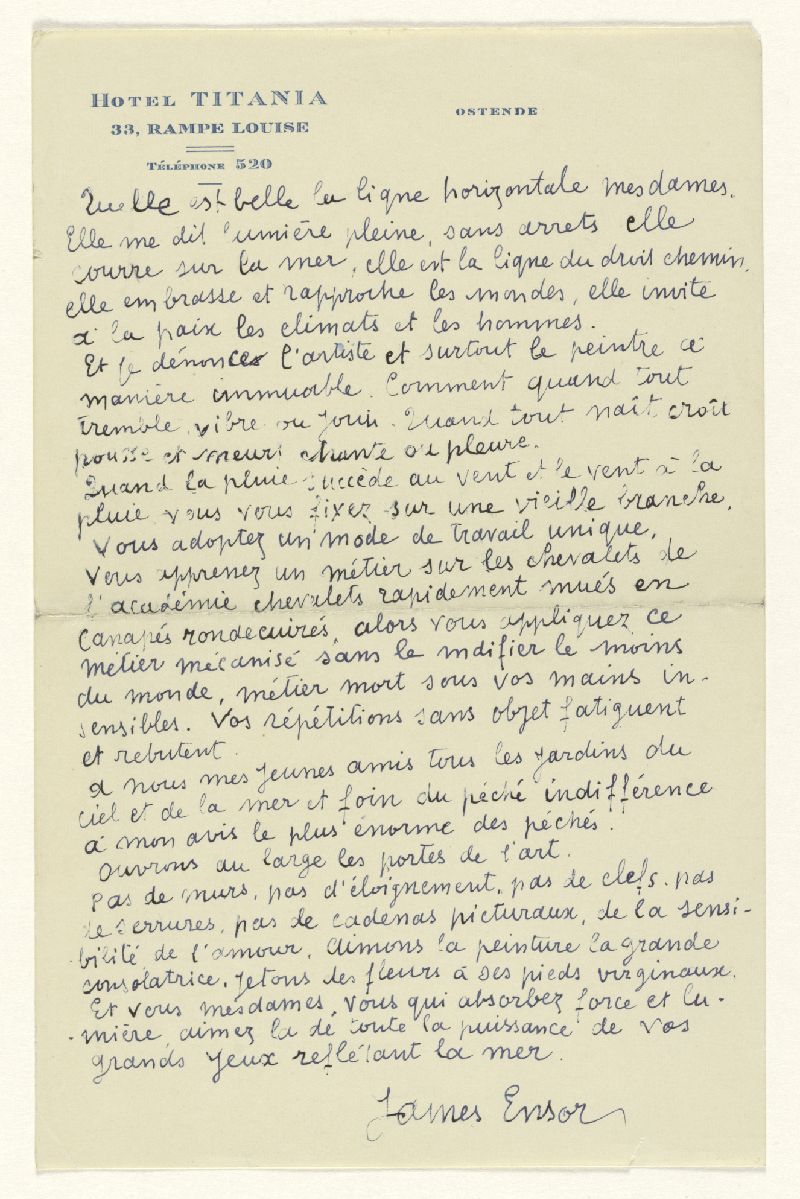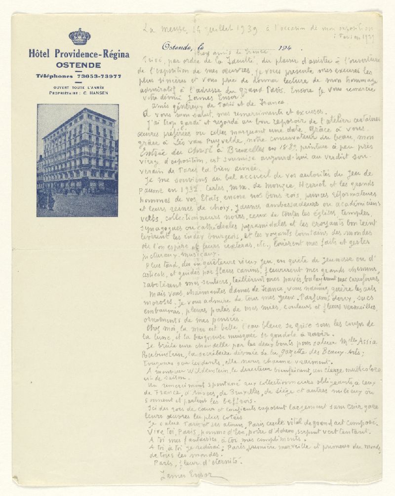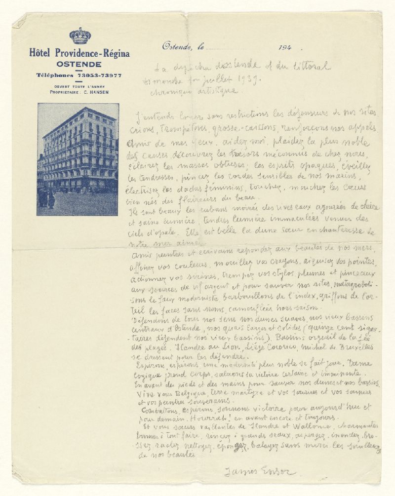 Le KMSKA possède plus de 500 documents d'archives de James Ensor ou en liaison avec lui, qui n'ont encore jamais été rendus accessibles au grand public. Comprenant 76 manuscrits et 339 lettres et cartes postales, ces archives constituent un complément précieux aux écrits de l'artiste qui n'avaient jamais été dévoilés auparavant. En étudiant les lettres, les discours, les photographies et même les cartes de condoléances après sa mort, on peut se faire une idée de l'homme et de l'esprit artistique qui se cachent derrière les peintures mondialement connues.